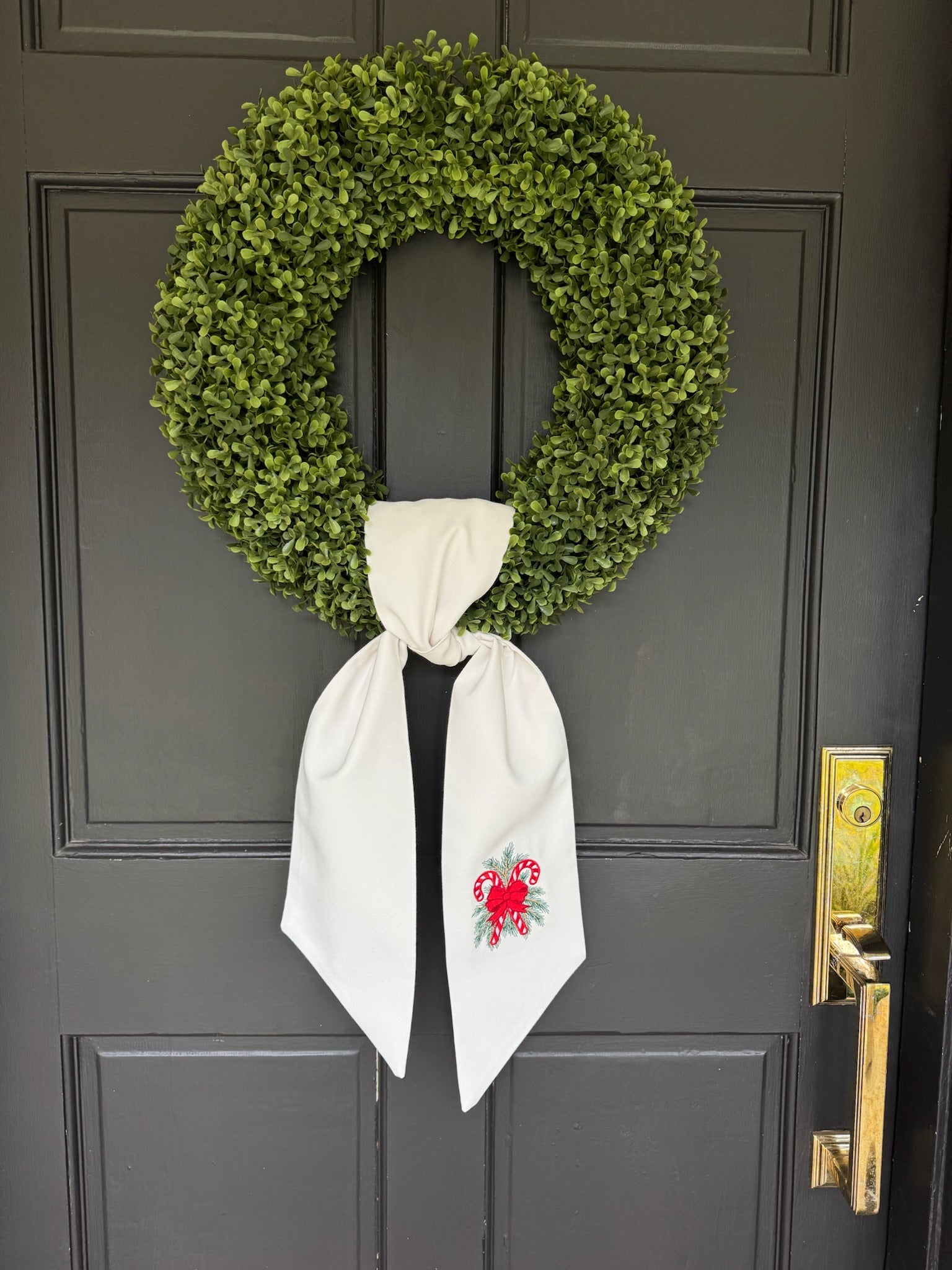 The newest addition to our Sash Stash! Our Candy Cane wreath sash is made of traditional reds and greens. Sophisticated and joyful!